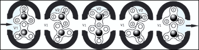 The basic operating principle is based on a set of two symmetrical rotors rotating in opposite directions. By means of the rotors rotating motion the inlet air volume is expanded. While one of the lobe sweep past the inlet port, one part of the air is captured, compressed and expelled through the outlet port. Figure 1 shows the retation sequence in stages with air volume V captured between lobe( 1 ) &( 2 ) With a pair of 3lobes' rotors, a total of 6 such cycle takes place in one full revolution.