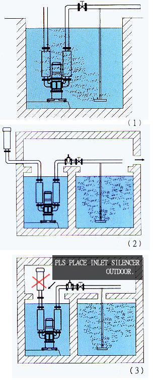 1.The inlet silencer should be placed erectly and installed outdoors to avoid suctioning the moisture from the tank to the blower. (as shown in drawing 2)