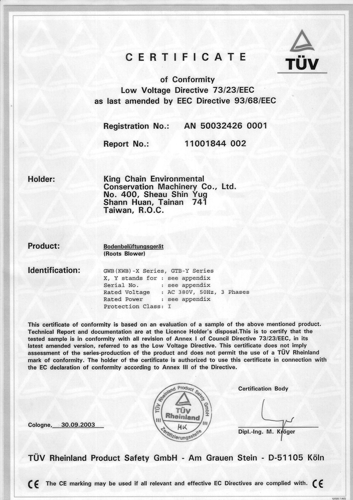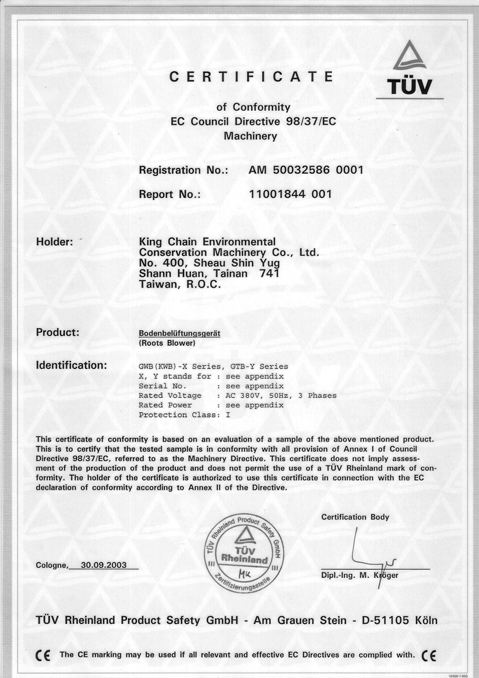 目前主要推廣外銷產品介紹如下: 機種齊全,無論二葉式三葉式、陸上型水中型、皮帶式直結式、平臥式或直立式應有盡有,另有高壓、高真空用多段式魯氏鼓風機可依需求訂製,本公司在國內魯氏鼓風機製造業中設計技術領先群倫, 於1999年首先推出 水中型魯氏鼓風機並獲得專利(新式樣第063930號),於2000年推出氣冷 直立式魯氏鼓風機並獲得專利(新型第1166220號),於2009年推出 導流散熱立式魯氏鼓風機並獲得專利(新型第M363521號),於2009年再推出 直立多段導流散熱式魯氏鼓風機並獲得專利(新型第M365990號),因性能優異同業競相仿造已成為市場主流。 本公司二廠合計約一千坪,資本額貳千萬元,在設計研發上不斷精益求精。材料不斷提昇,加工技術與精度持續檢討與要求,組裝水準力求盡善盡美,為求完善於2000年將工廠管理與製程導入ISO9001,並於2001年獲得SGS/UKAS認證通過,2003年CE歐盟安檢認證通過,如今本公司全體員工將再接再勵,不斷努力開創更美好未來,並感謝各方支持與鼓勵 ,若有任何需求也歡迎來電參觀。