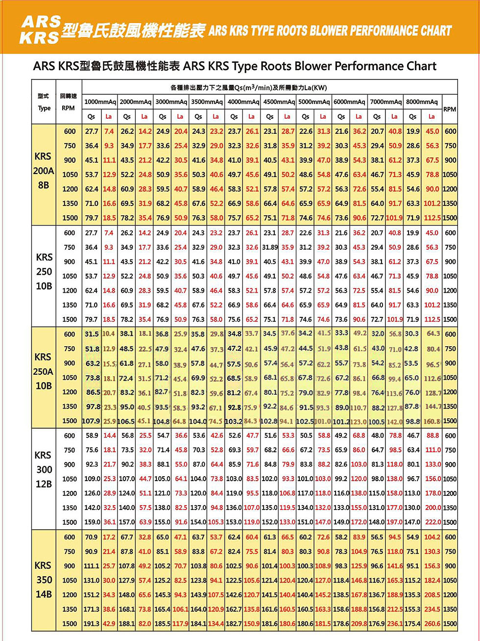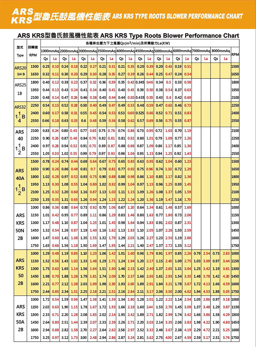 ARS&KRS型性能表